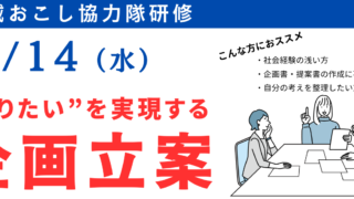 【内容】地域おこし協力隊が、任期中の活動や任期終了後の就業・起業の準備を円滑に行えるよう、多くの協力隊員に共通して必要となるスキルとして、「企画立案」及び「情報発信」について学ぶ研修を開催します。